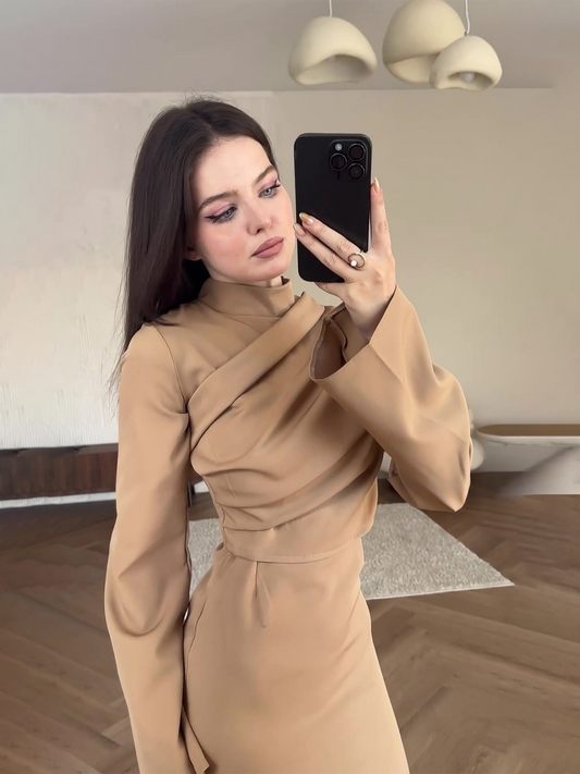 MS459#Vestido con diseño de cuello alto y manga larga con mangas de loto, con sentido del temperamento