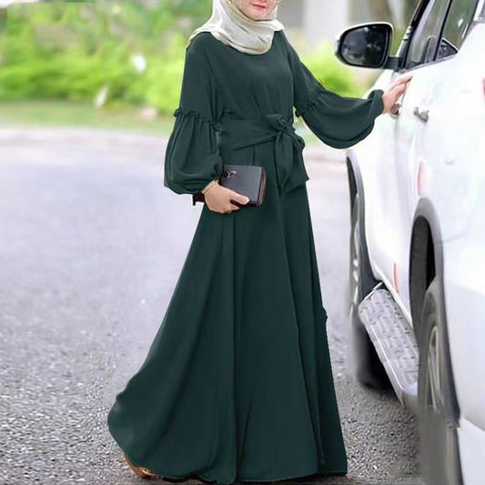 MS216#Vestido musulmán plisado con cintura de satén