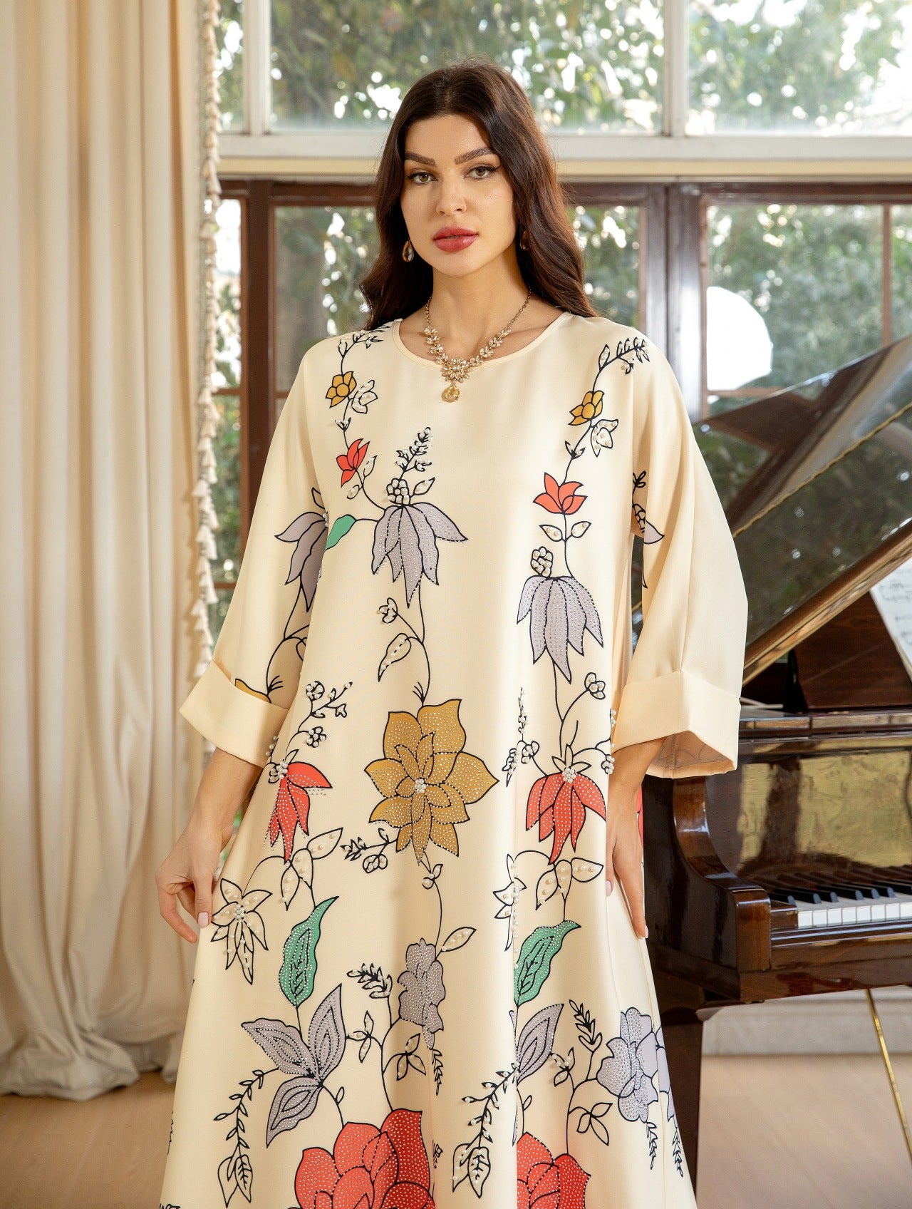 Túnica étnica de Oriente Medio con estampado de diamantes calientes y cuentas de burbujas de moda árabe para mujer