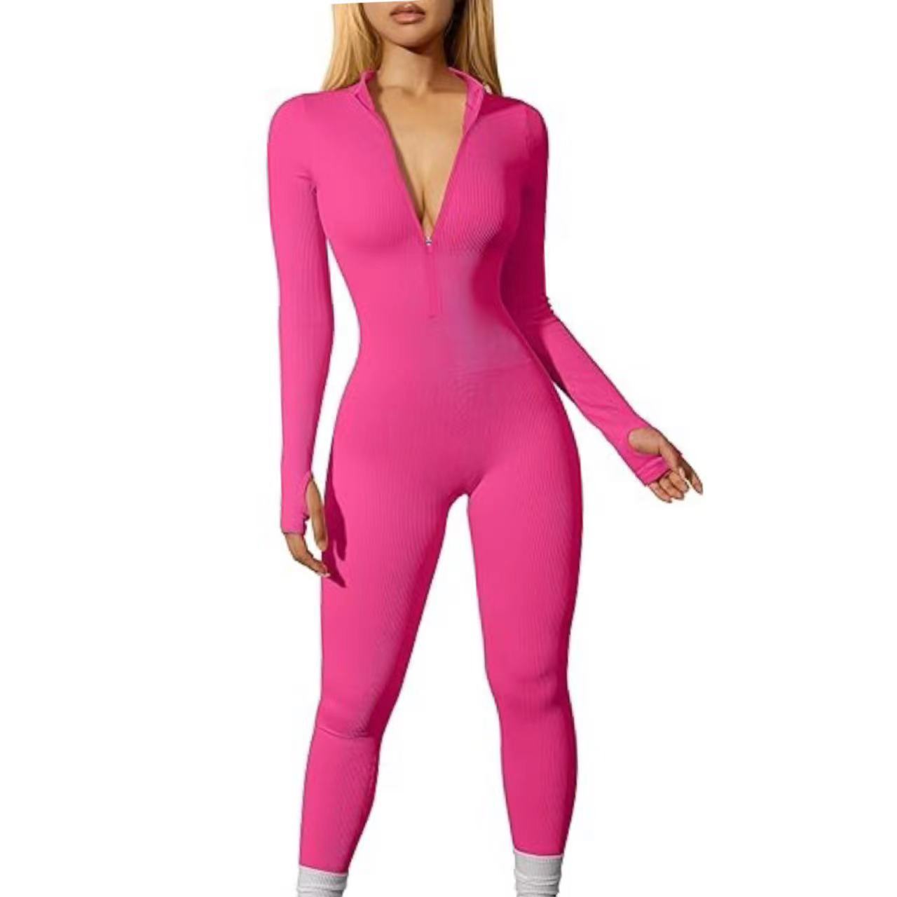 FS315#Mono deportivo para mujer transfronterizo europeo y americano, mono de entrenamiento con cremallera de manga larga acanalado, pantalones casuales ajustados