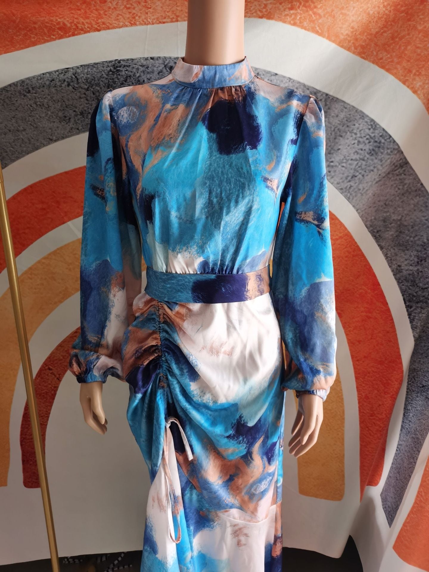 MS483#Vestido largo con cordones y mangas abullonadas con estilo grafiti