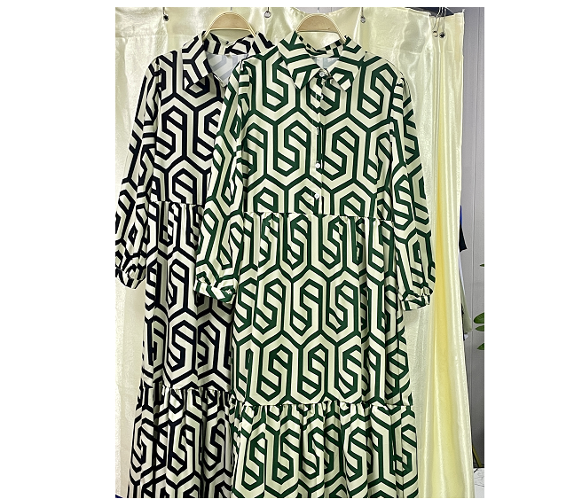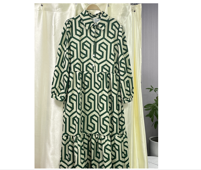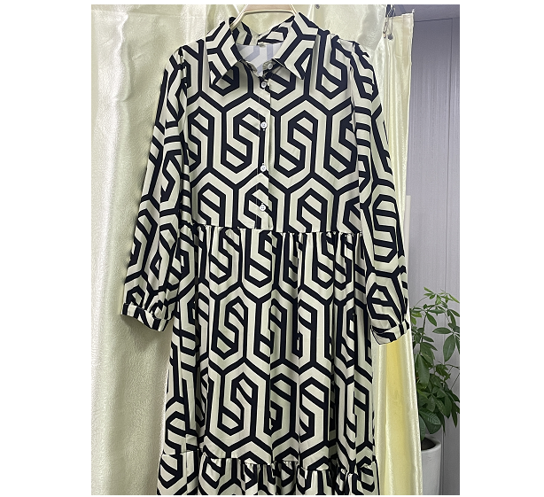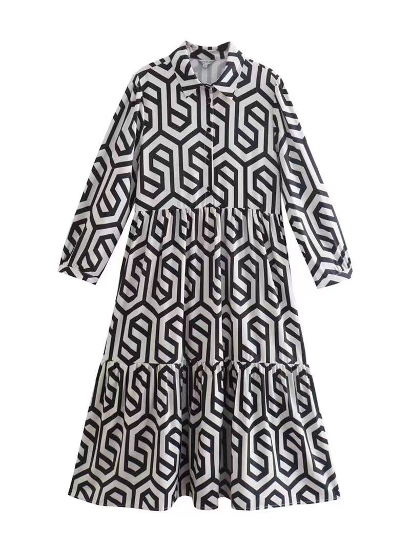 MS095#Vestido de manga larga con estampado geométrico y solapa