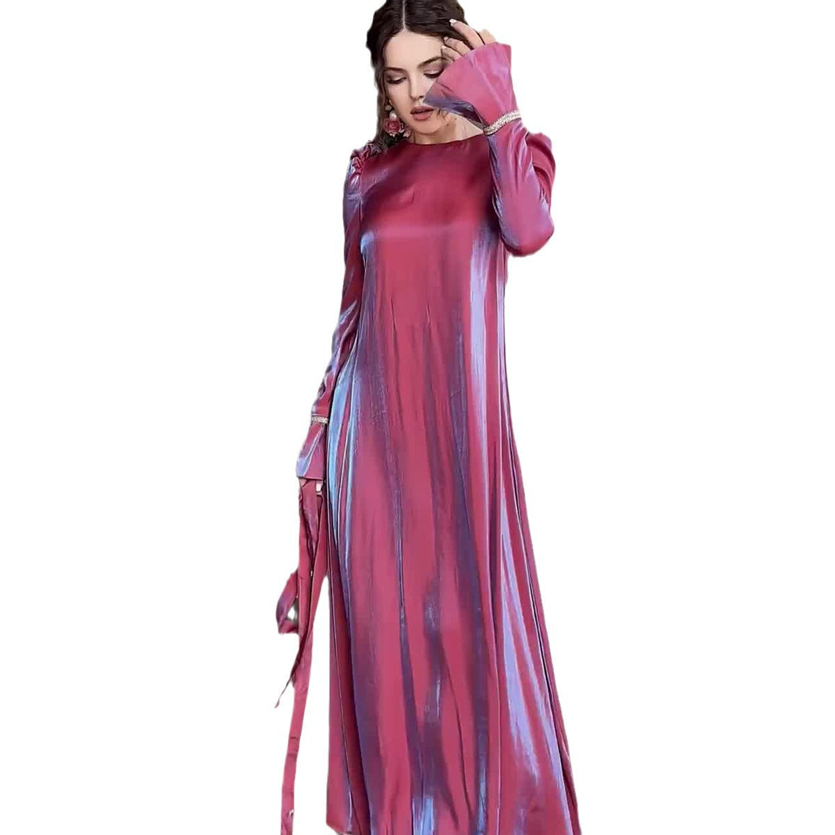 MS439#Vestido con mangas acampanadas y cremallera en satén de cristal de color liso con destellos