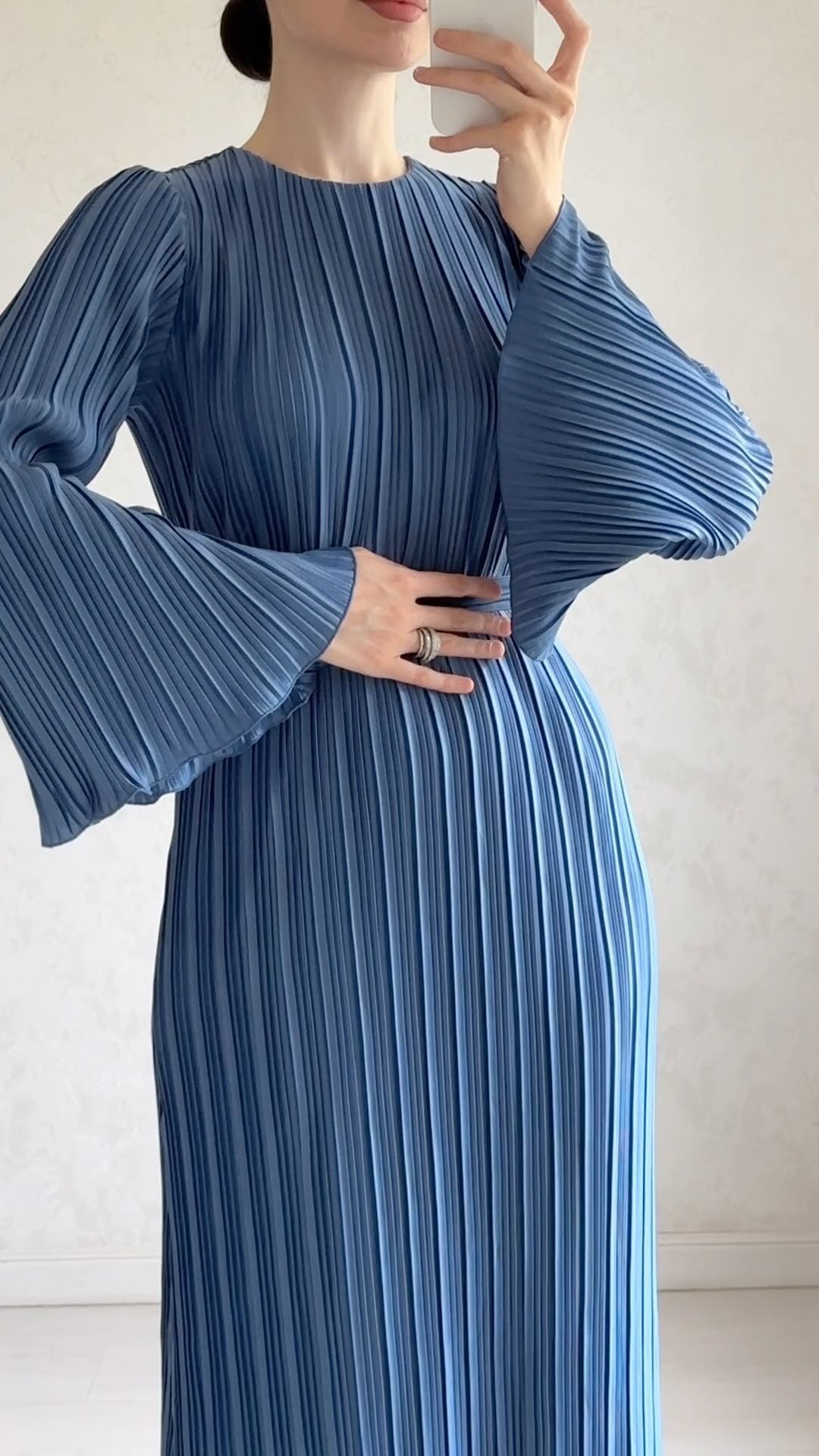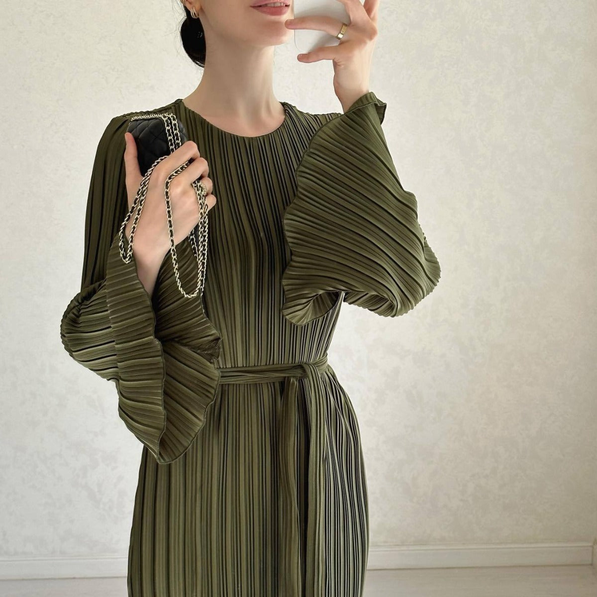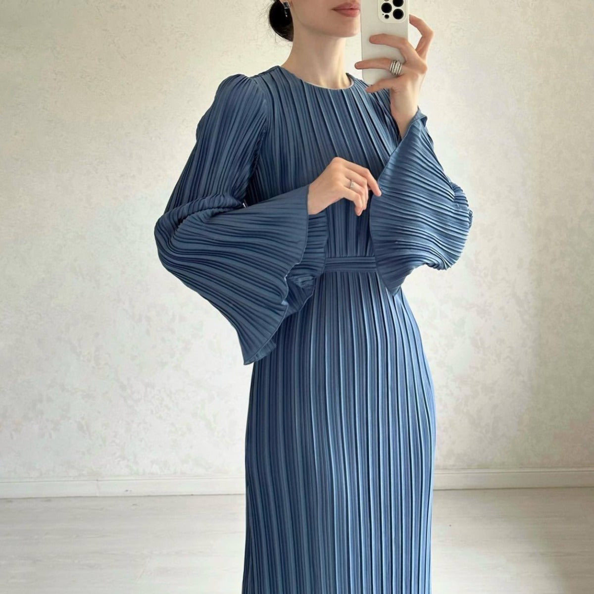 MS444#Vestido largo plisado con mangas acampanadas y falda larga para mujer
