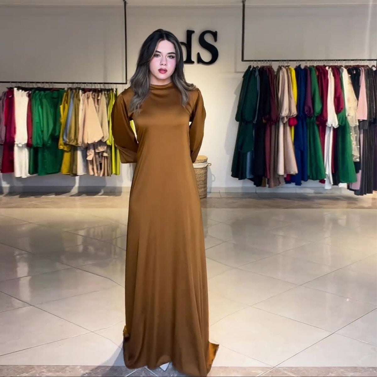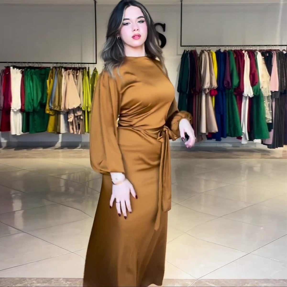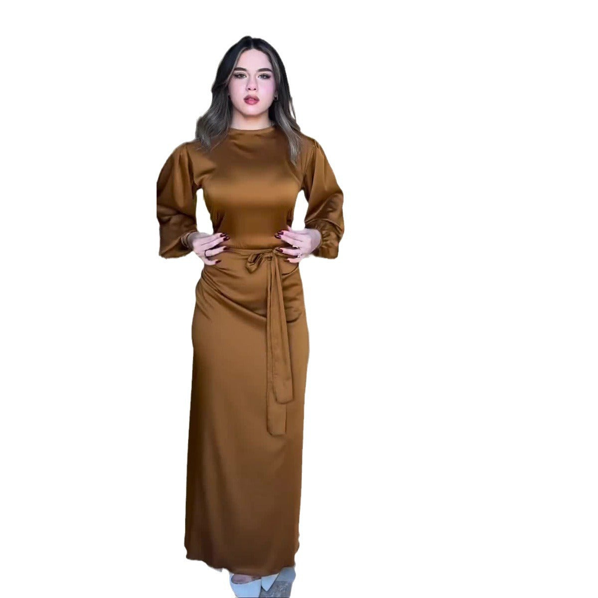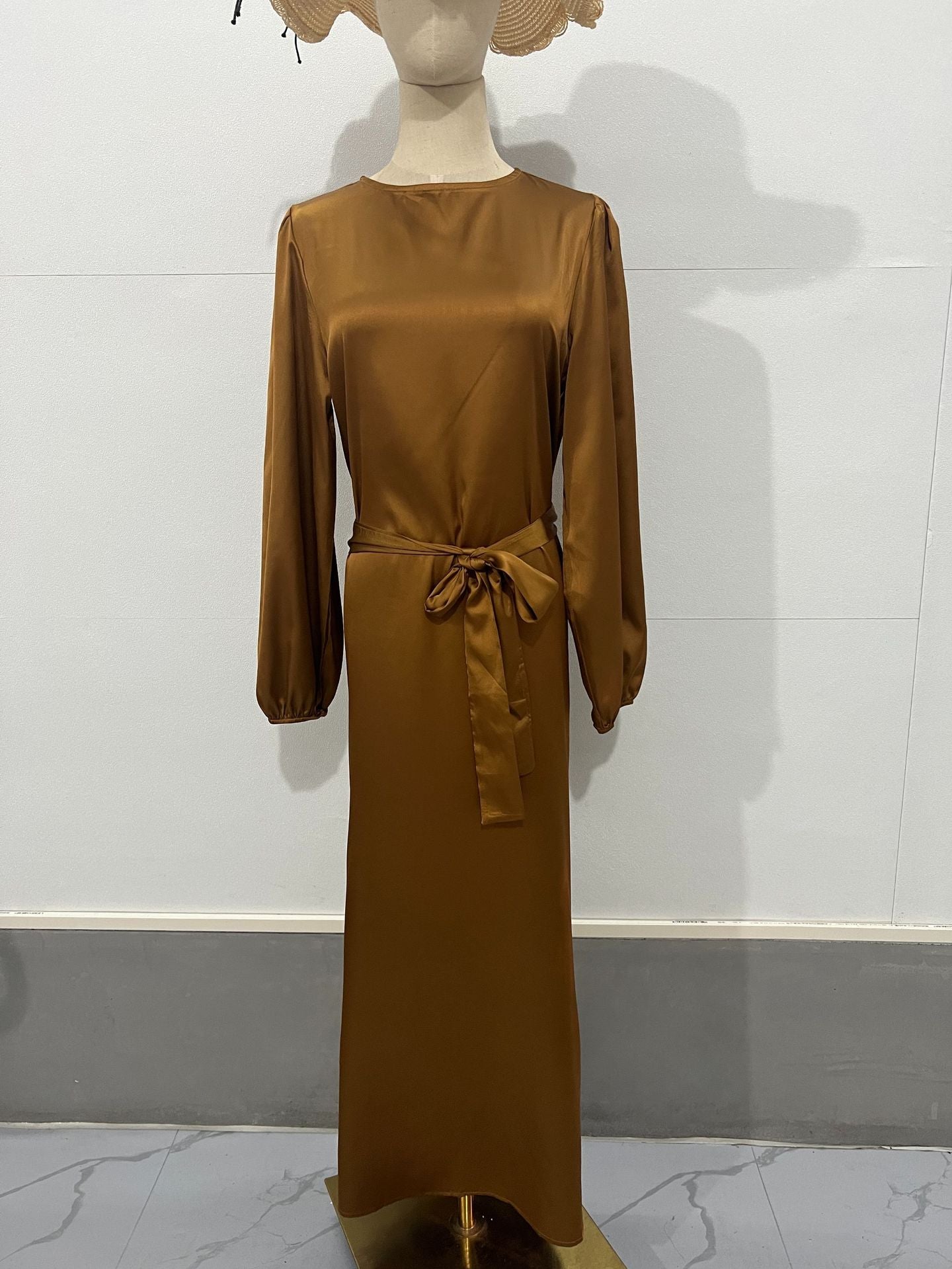 MS450#Vestido de satén de color liso con cinturón para mujer
