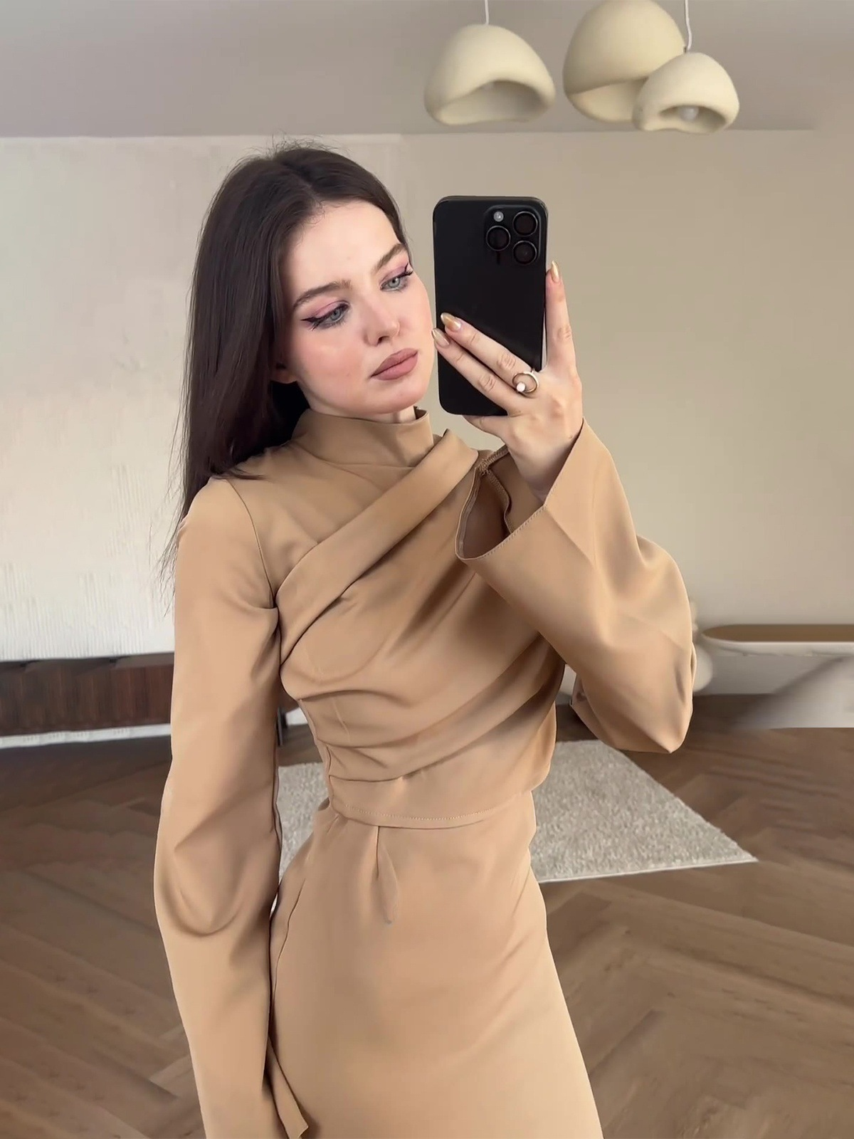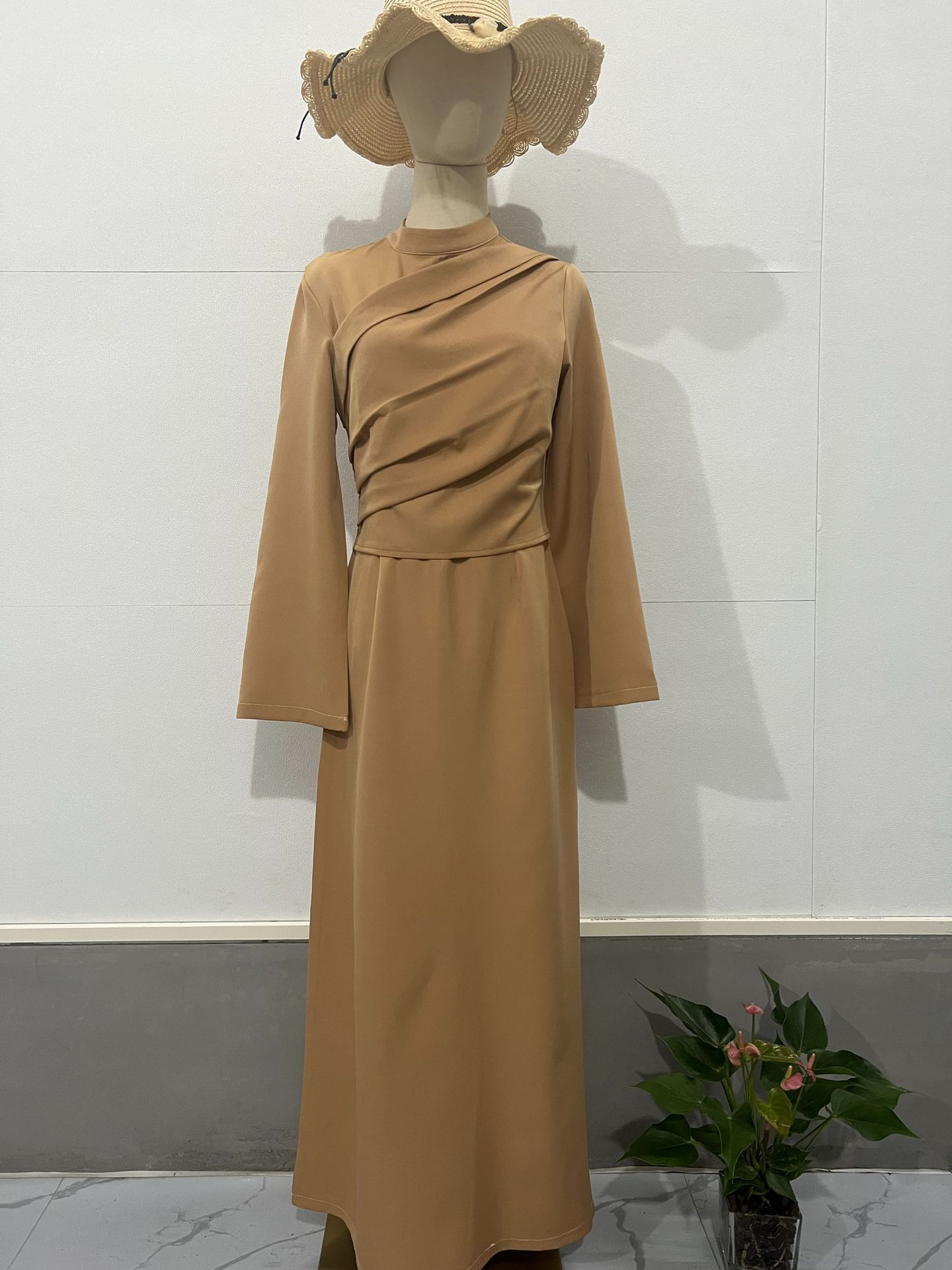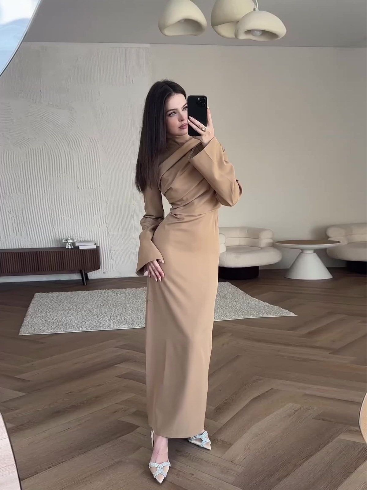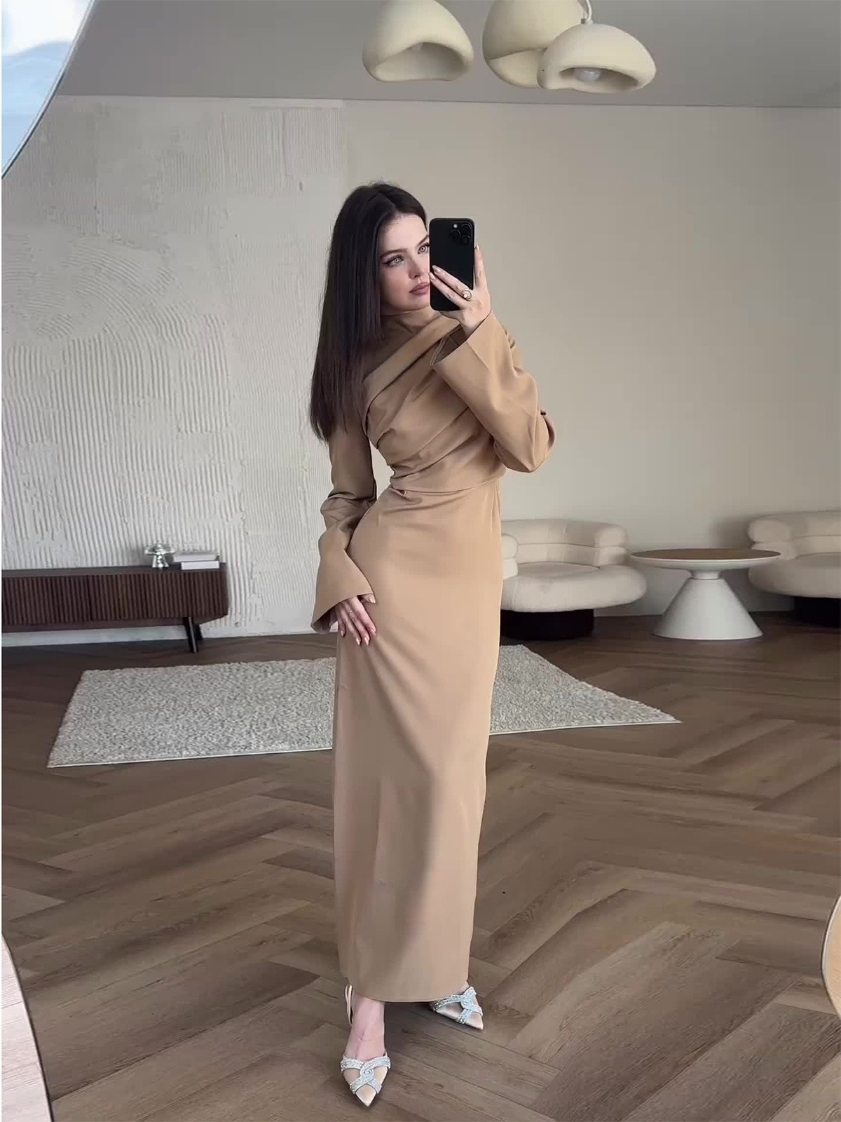 MS454#Vestido de manga larga plisado sensible a la presión con diseño de color sólido y temperamento elegante