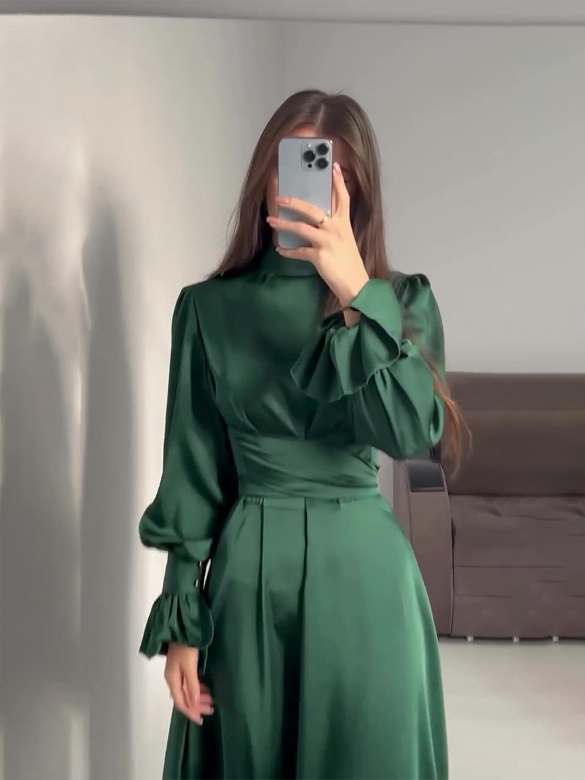 MS457#Vestido verde de manga larga con cinturón y mangas abullonadas