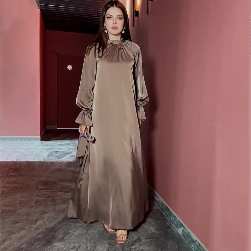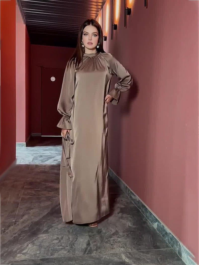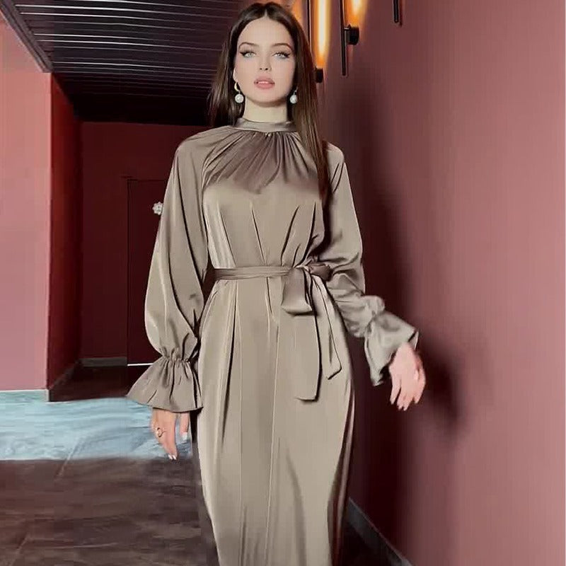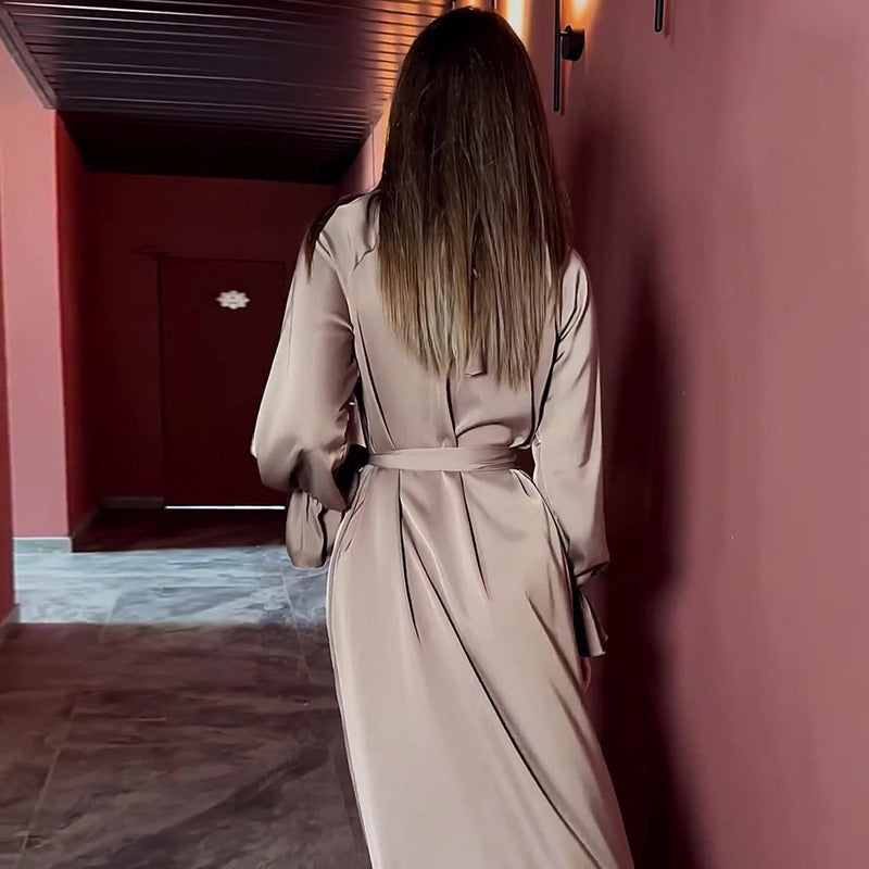 MS509#Vestido holgado de manga larga de satén de color liso con cinturón para mujer